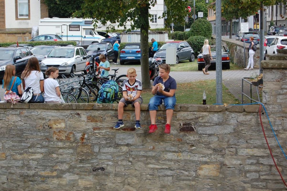 Auf der Schulmauer. Ein Teil des ehem. Schulhofs ist Parkplatz.